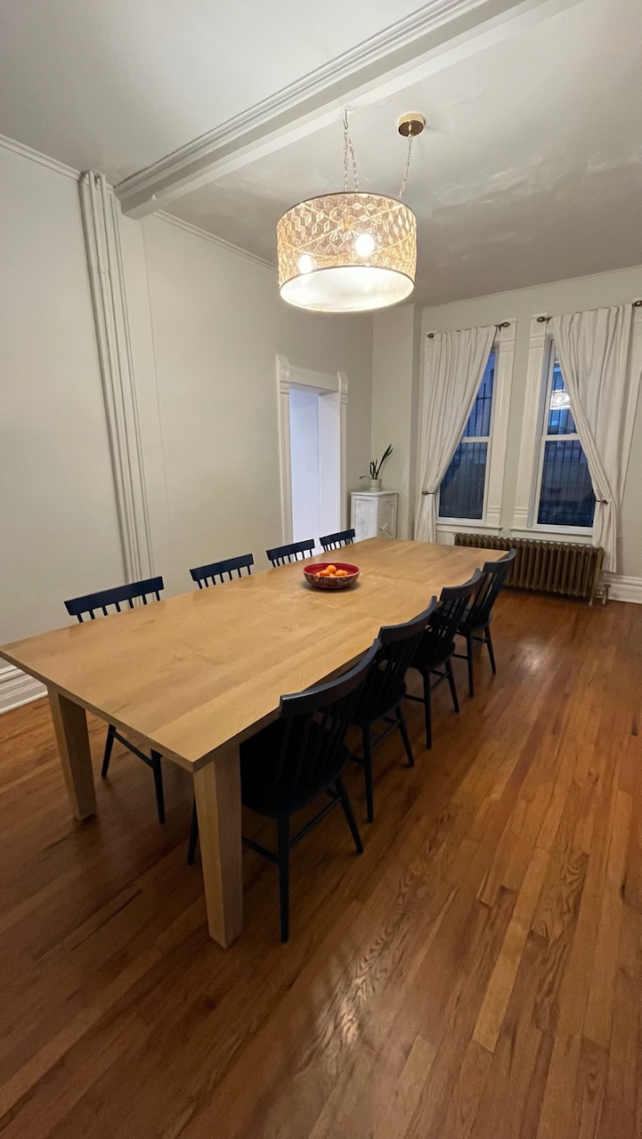 Large table and seating for eight. Good for dining, puzzles, or working from home.